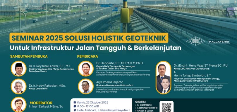 Himpunan Pengembangan Jalan Indonesia (HPJI) bersama Maccaferri Indonesia mengundang para profesional, akademisi, dan pelaku industri konstruksi untuk hadir dalam acara Seminar Nasional HPJI 2025 bertajuk:“Solusi Holistik Geoteknik untuk Infrastruktur Jalan Tangguh dan Berkelanjutan.” Acara ini GRATIS & diselenggarakan pada:📅 Kamis, 23 Oktober 2025🕗 Pukul 08.00 – 12.00 WIB📍 Hotel Ambhara, Jakarta Selatan Seminar ini bertujuan […]